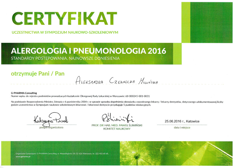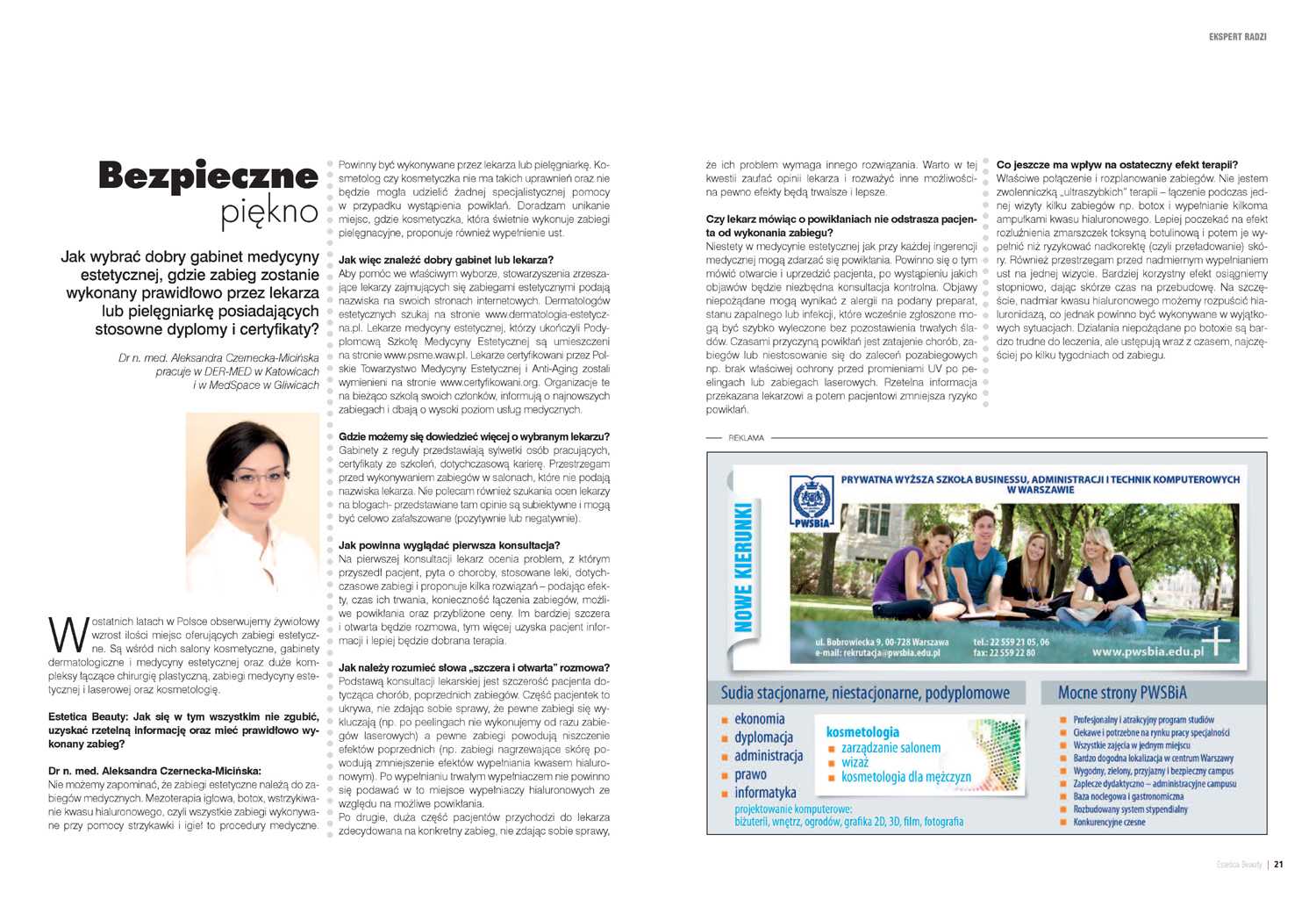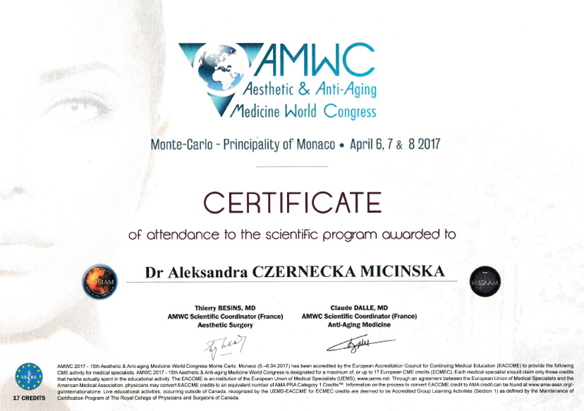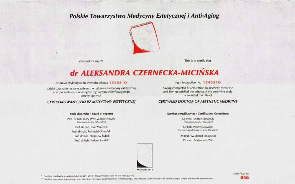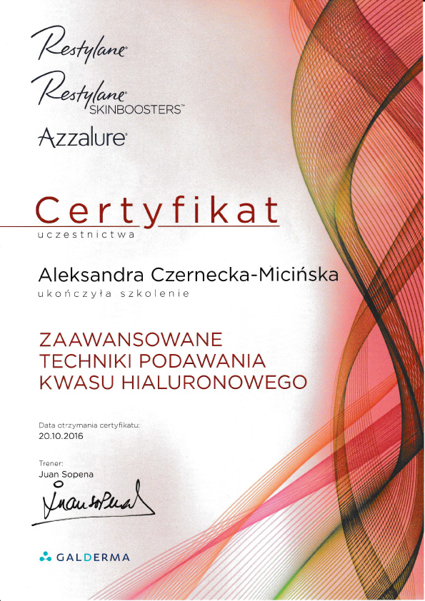 Od 18 lat jestem certyfikowanym lekarzem medycyny estetycznej i anty-aging. Skończyłam Podyplomową Szkołę Medycyny Estetycznej PTL w Warszawie. Aby pogłębiać swoją wiedzę uczestniczyłam w międzynarodowych konferencjach, a umiejętności praktyczne szkoliłam na wielu kursach m. in. Q-med Academy. Od wielu lat jestem również trenerem najnowszych technik podawania kwasu hialuronowego. Jestem szkoleniowcem Restylane i expertem Teosyal.